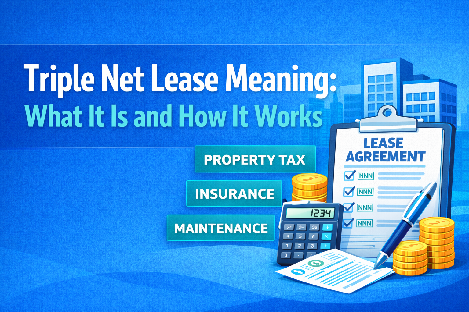 A triple net lease, often shortened to NNN lease, is a commercial lease where the tenant pays base rent plus the three major operating expenses: property taxes, building insurance, and maintenance. In other words, the tenant carries most of the property’s operating burden while the landlord collects a steadier net rent stream. This net lease structure is common in retail and industrial real estate and is central to how many corporate occupiers and investors manage costs and control. Asset managers, property managers, and finance teams rely on NNN terms to forecast cash flows, while tenants use them to tailor operations and budgets. Understanding how NNNs allocate expenses, reconcile costs, and assign responsibilities helps both owners and occupiers optimize total occupancy costs and operational control.